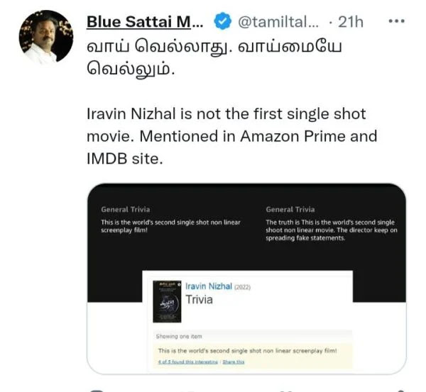 ஆனால் இதற்கு பார்த்திபன் ரசிகர்கள் மத்தியில் எதிர்ப்பு கிளம்பியது. இப்போது அமேசான் பிரைம் நிறுவனமே இது இரண்டாவது சிங்கள் சாட்டில் எடுக்கப்பட்ட படம் என குறிப்பிட்டுள்ளதால் ப்ளூ சட்டை மாறன் பார்த்திபனை வச்சு செய்துள்ளார்.